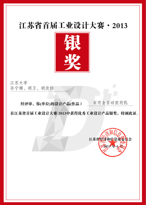 6月20日,江苏省首届工业设计大赛最终奖项揭晓,我院工业设计系孙宁娜、胡卫、胡欣怡的创意设计作品“家用全自动煎药机设计”经过初评、终评和最终答辩环节后,喜获银奖。