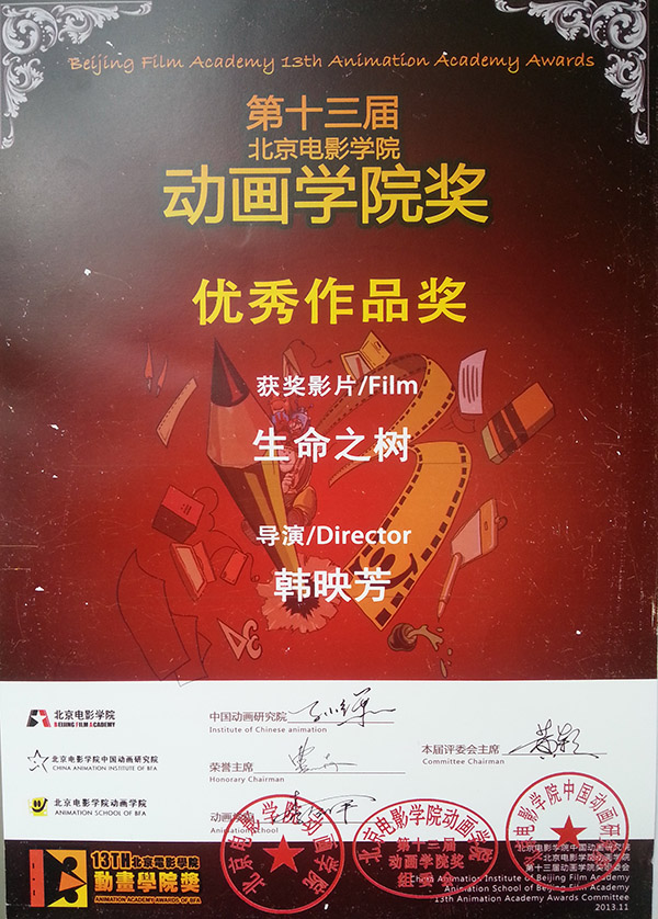 “动画学院奖”素有“中国动画短片奥斯卡”之称,是由北京电影学院举办的国际性动画创作赛事,大赛以 “本土、艺术、原创”为主题,从多角度、全方位来剖析国际动画化与动画教育领域所取得的最新成果和现状。通过其在业界及学生中的影响力与号召力,本次“学院奖”收到自海外各地(法国、新西兰等地)及国内各高校(如清华大学美术学院、中央美术学院、中国传媒大学、台湾国立大学等)多达3000部形式多样丰富作品。由我院韩涛老师、崔晋老师指导的《轨道之上》(作者:金剑)以及《生命之树》(作者:韩映芳)两部作品喜获优秀作品奖。