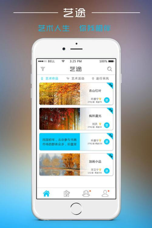 项目简介:艺途网络科技有限公司,依托艺术学院新媒体中心技术研发力量和丰富的人脉资源,主要从事艺术细分垂直行业的移动互联网整合。在艺术学院张凯副院长直接领导下,中心主要有杨东润老师和刘庆立老师负责具体移动技术开发业务。本项目定位群体为:高校艺术群体及相应层次以上的艺术从业人员,着眼于艺术垂直细分领域市场,从线上聚合信息,从线下转换商业利润。本项目在团队研发经验和行业经验的基础上,抓住移动互联网点对点互联互通的本质、重点考虑了艺术领域在信息平台便捷、准确方面的诉求,严格遵循APP设计规范和用户体验至上原则,解决了如何将信息交流形式和内容相匹配的问题。