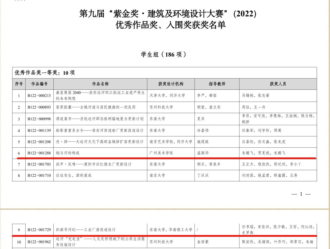 “紫金奖·建筑及环境设计大赛”由江苏省委宣传部、江苏省住建厅、中国建筑学会、中国勘察设计协会与中国风景园林学会主办,自2014年起已成功举办9届,是具有全国影响力的建筑与环境设计品牌赛事。第九届大赛以“千年运河 活力家园”为主题,学生组共征集来自东南大学、同济大学等国内一流高校设计作品1038项,经评审产生学生组优秀作品奖89项(一等奖10项、二等奖30项、三等奖49项)。