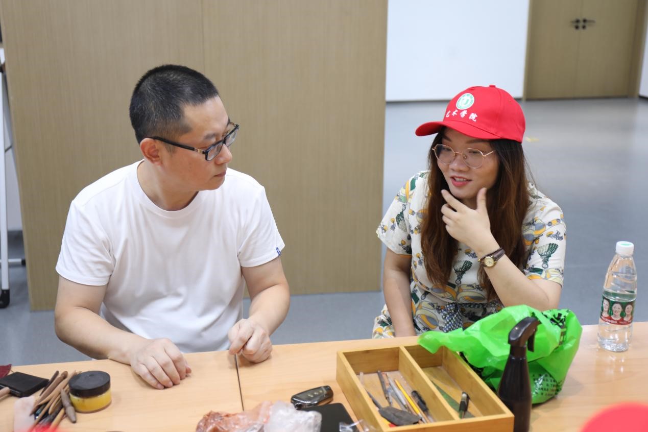 (吴俊峰老师为实践团队讲解紫砂花器的相关知识。韦城 摄)
