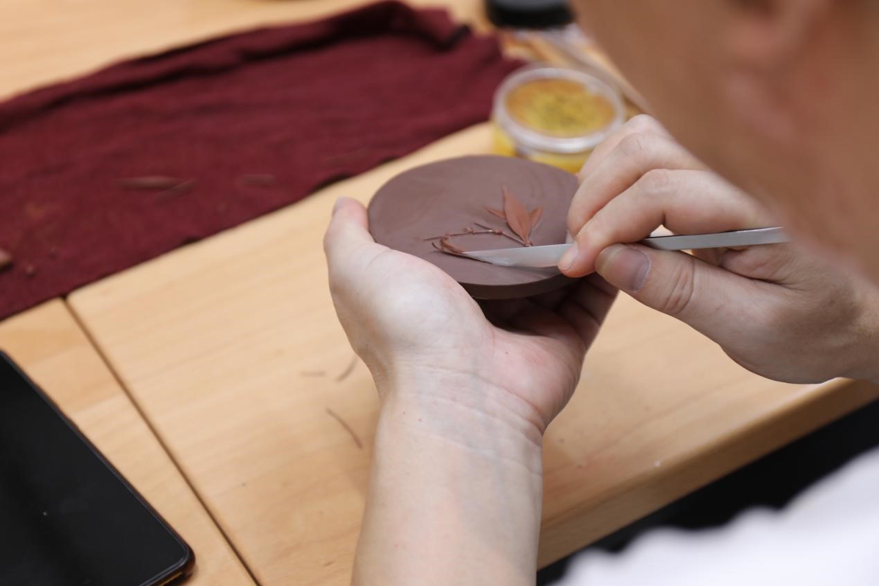 (吴俊峰老师演示花器竹叶装饰技法。韦城 摄)