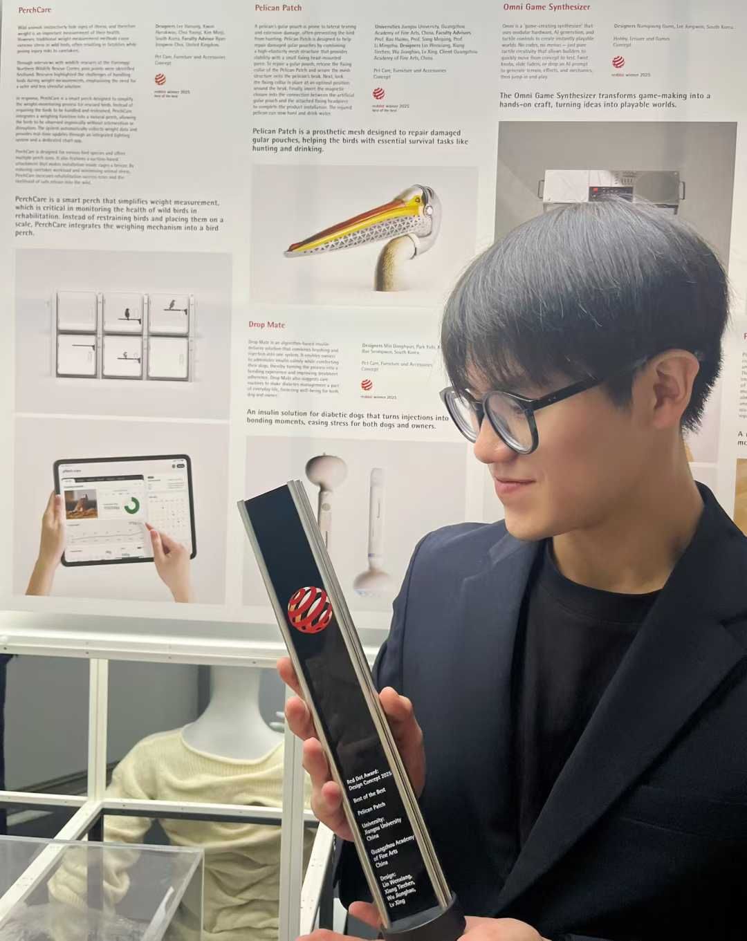 The 2025 Red Dot Awards ceremony recently kicked off in Singapore. A collaborative design project titled "Pelican Patch" by Lin Wenxiang, Xiang Tiechen, and Lü Xing (all master's students from our institute) and Wu Jinghao from Dongguan University of Technology stood out among global competition entries, securing the prestigious Red Dot Award: Design Concept — Best of the Best. As the highest honor in the Red Dot Awards category, this achievement marks our university's historic breakthrough in this international design competition. The team's maiden victory in the top-tier award represents a milestone in advancing our design education and cultivating innovative talent.