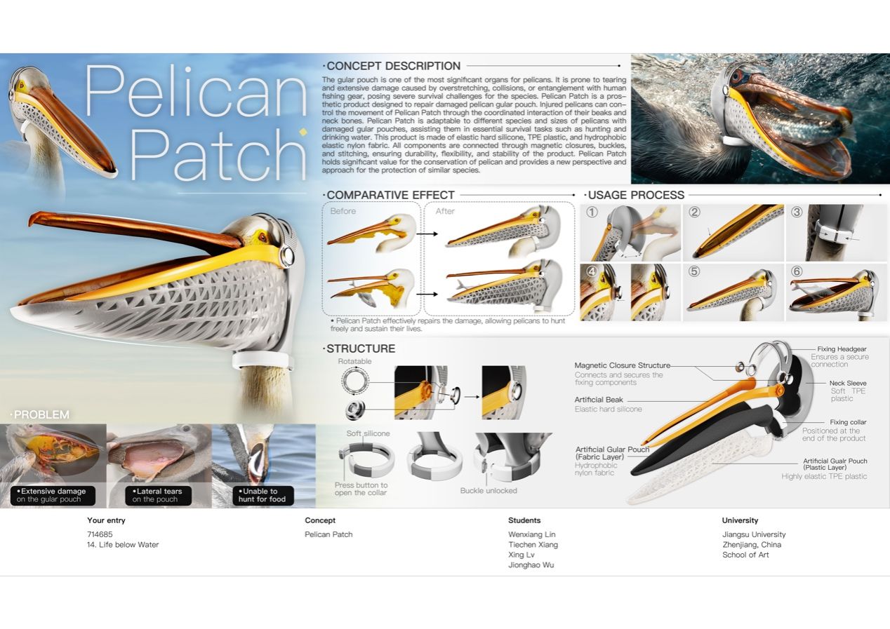 The award-winning project "Pelican Patch" tackles wildlife conservation by creating an innovative artificial laryngeal prosthesis for injured pelicans. This groundbreaking design demonstrates exceptional systematic and creative approaches in structural engineering, biological behavior adaptation, and new material applications. It not only showcases the design team's profound understanding of biological morphology and functionality but also highlights the efficient integration of advanced materials in life-saving medical scenarios.