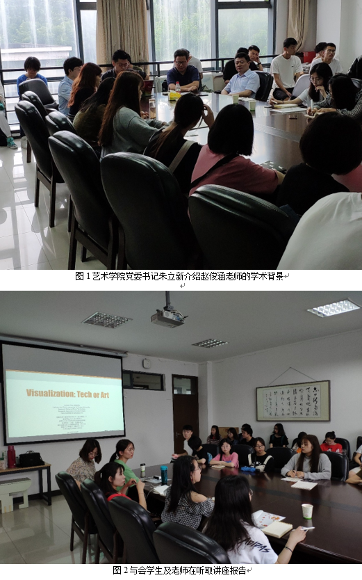 6月26日上午,艺术学院邀请普渡大学计算机图形技术系博士候选人,科研助理讲师赵俊涵老师在艺术楼1304会议室为学院青年教师和部分研究生作有关数据可视化在设计中的应用的学术讲座,讲座由艺术学院党委书记朱立新主持。